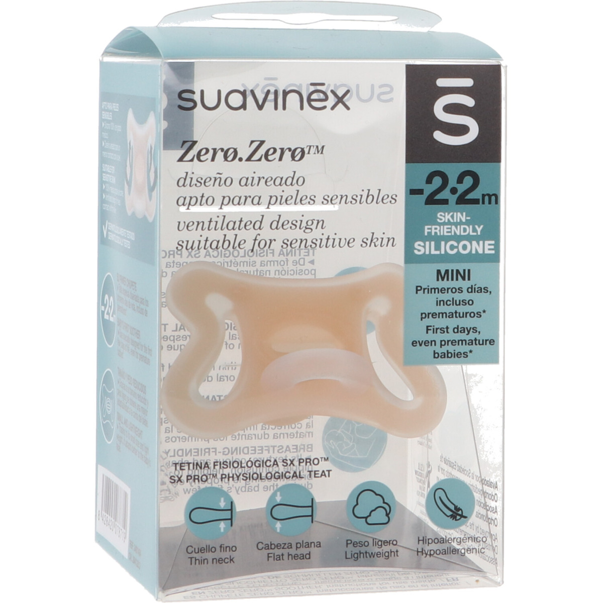 Chupete con tetina fisiológica SX Pro, diseñado para respetar el desarrollo bucodental del bebé. La tetina de este chupete ha sido diseñada para no invadir la cavidad oral y proporcionar al bebé la misma sensación que experimenta en su estado natural cuando no lleva chupete.
